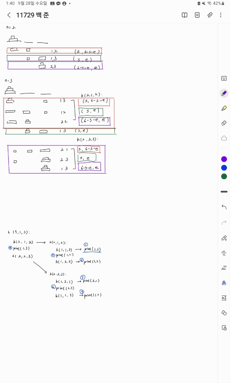 사실 아직까지는 재귀 알고리즘이 한번에 생각나지 않고, 저렇게 작은 숫자를 대입해서 직접 그려봐야 반복되는 것이 보인다.
